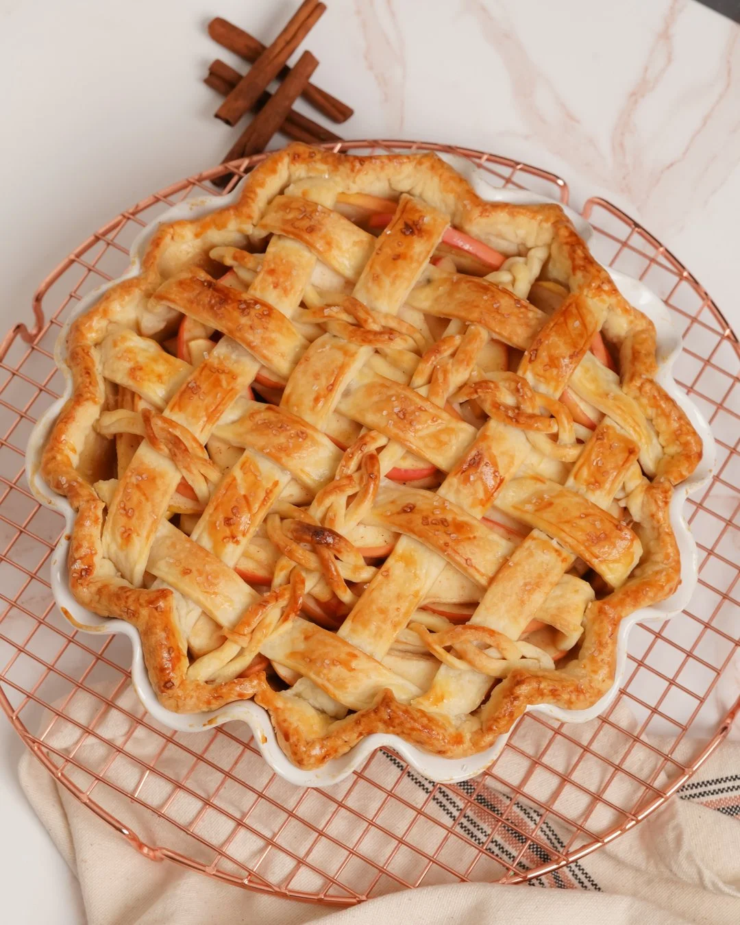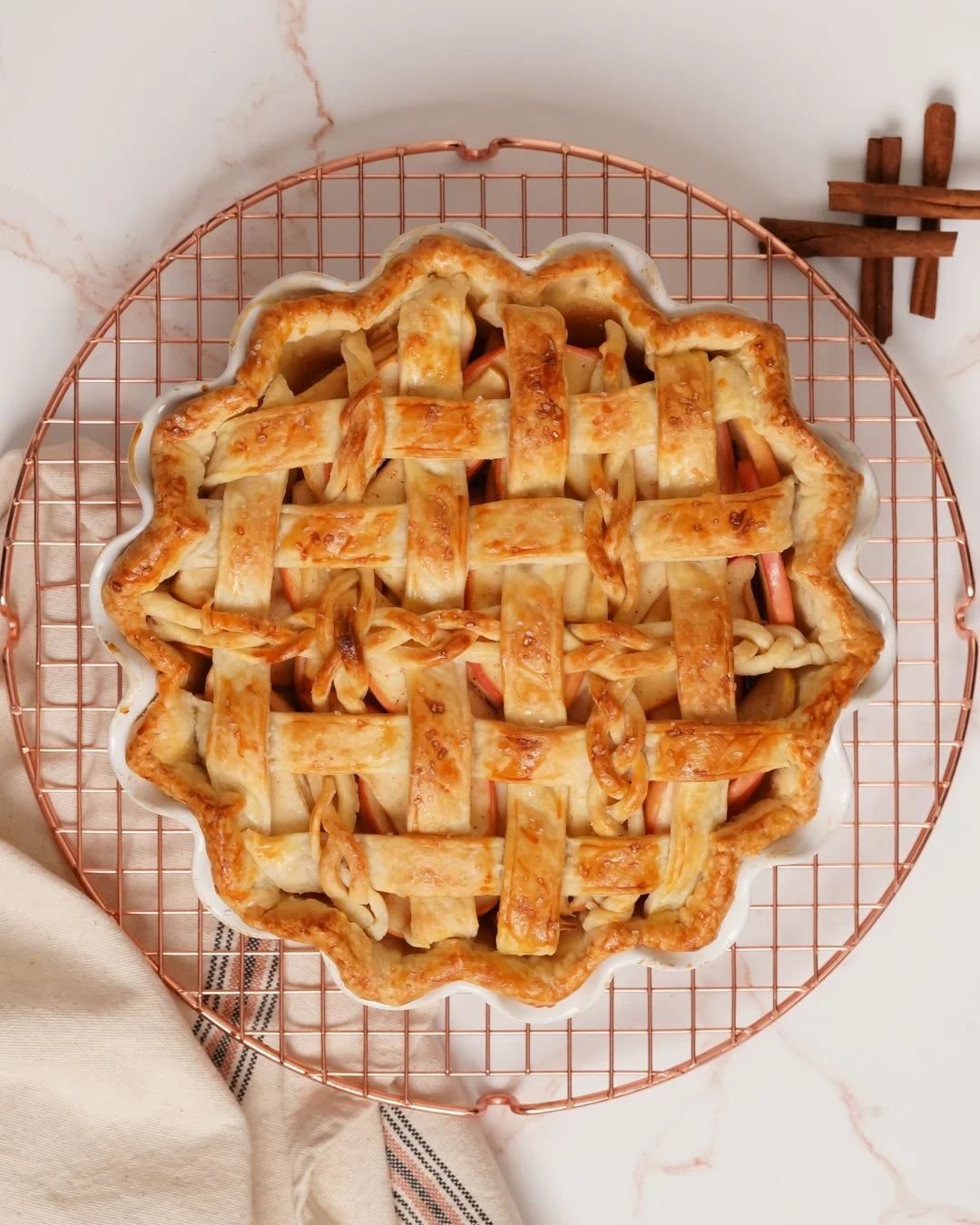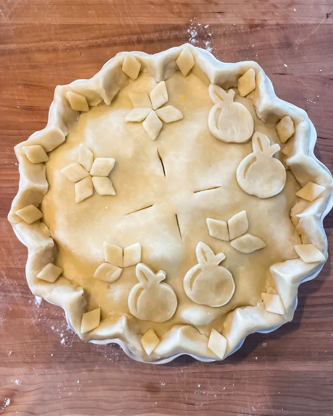 Because the filling is very simple to make, I also really enjoy spending more time on decorating this pie. Cute little pie dough cutters or a detailed lattice are my favorite ways, but really the sky is the limit. When it comes to decorating and rolling, keeping your pie dough cold is critical. Cold dough holds its shape, sticks less, and prevents shrinking in the oven. Chilling the dough between steps or anytime it gets too warm might extend the length of the process, but the result is worth it.