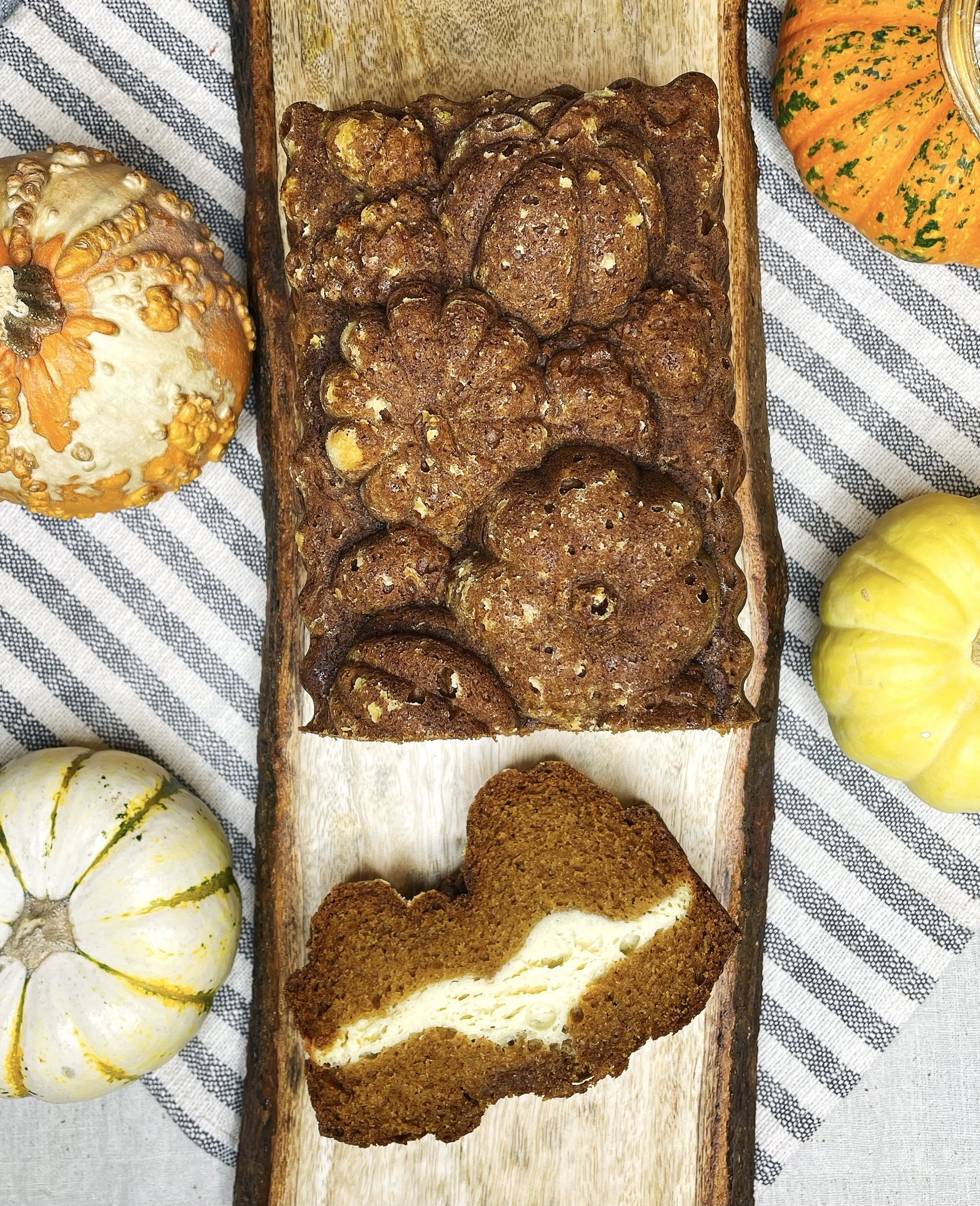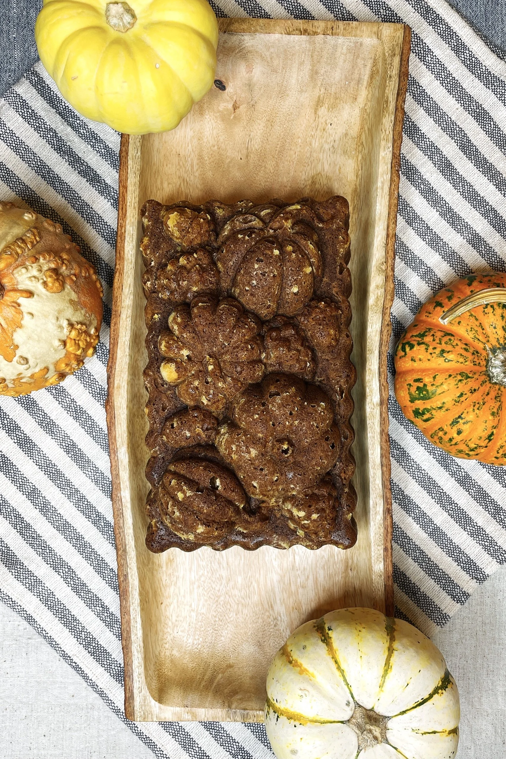 To achieve the pumpkin decoration on the cake’s crust, I used a fancy Nordic Ware pan. It not only created the nice details, but also gave me an even bake and a very easy release after cooling. However, you can bake this recipe in any 9in. loaf pan, and you’ll still have lovely results. Just be sure to grease your pan well with butter and flour to avoid sticking. And if you do use a regular loaf pan, I recommend lining the bottom with parchment paper to make extra certain that the cake will pop right out with nice even edges and no difficulty.