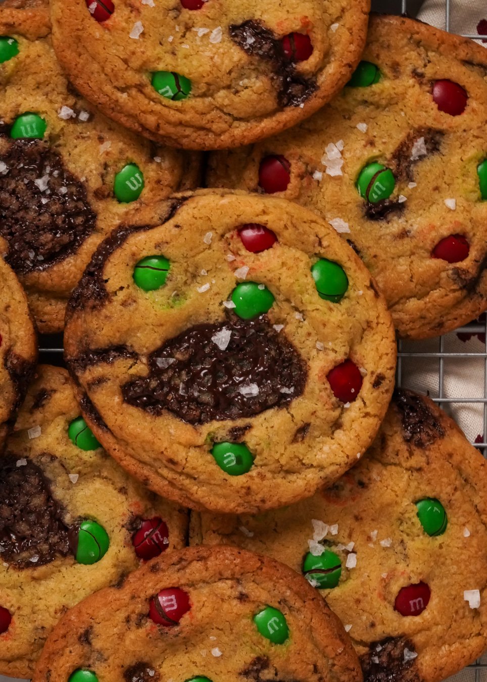 Ok these are THE BEST m&m cookies on the planet! I am obsessed! Brown butter enriched sweet cookie dough, thick chunks of dark chocolate, and of course those fun pops of chocolatey color make these m&m cookies just killer and perfect for holiday baking.