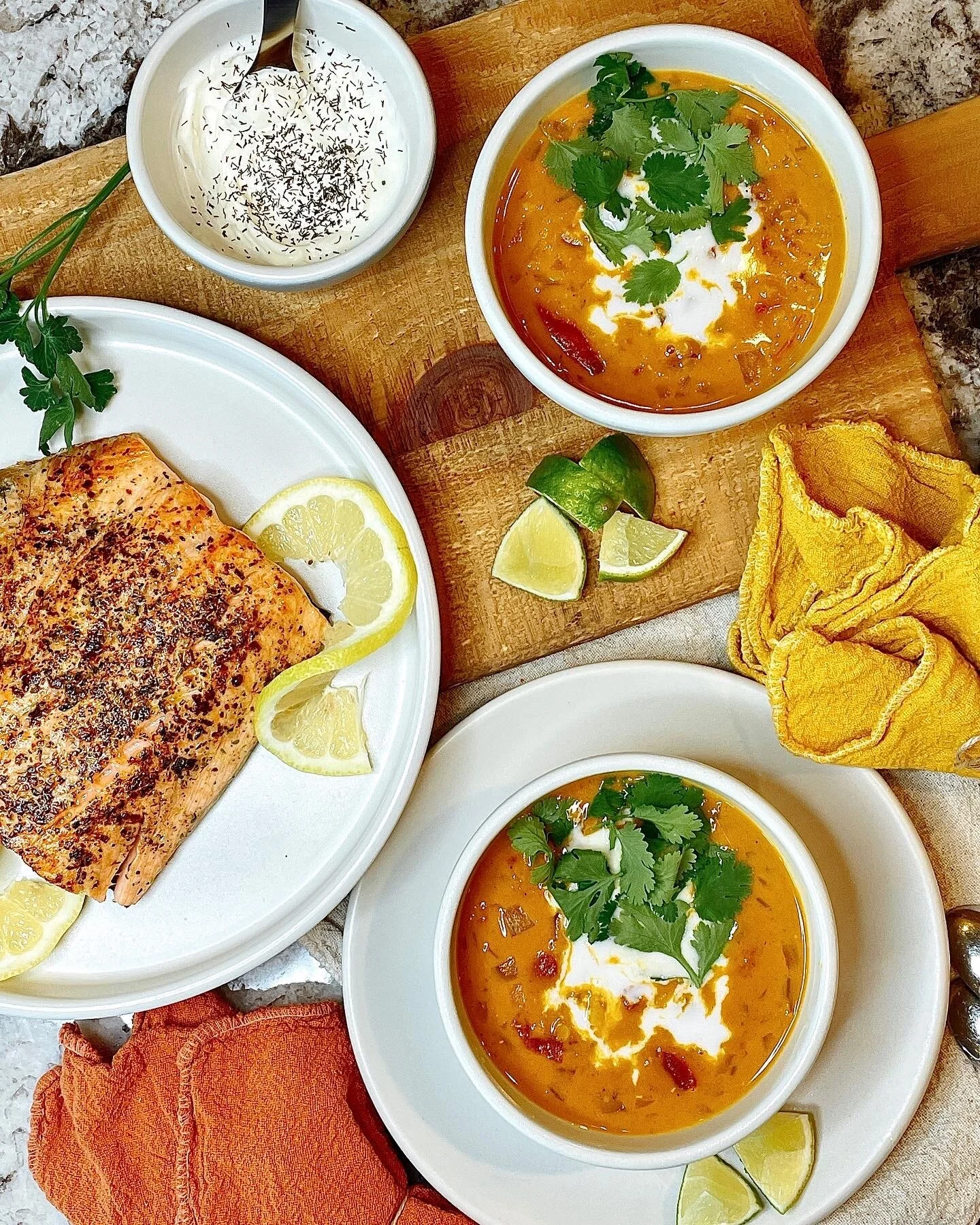 Packed with protein-rich lentils and creamy coconut milk, this soup on its own makes an excellent vegan entree, especially when paired with a hunk of fresh sourdough bread. However, you can also serve it with my recipe for simple salmon, as I have done here, for a really healthy and fortifying meal.