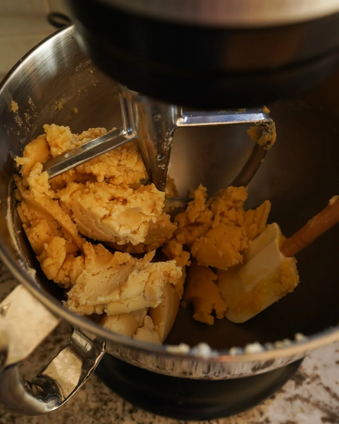 In the bowl of a stand mixer fitted the paddle attachment, combine the sugar and the butter. Mix on medium speed until the sugar is fully incorporated and the butter is fluffy. Add the egg + yolks and mix again to combine before adding the vanilla. Mix again, scraping down the bottom and sides of the bowl with a rubber spatula as needed.
