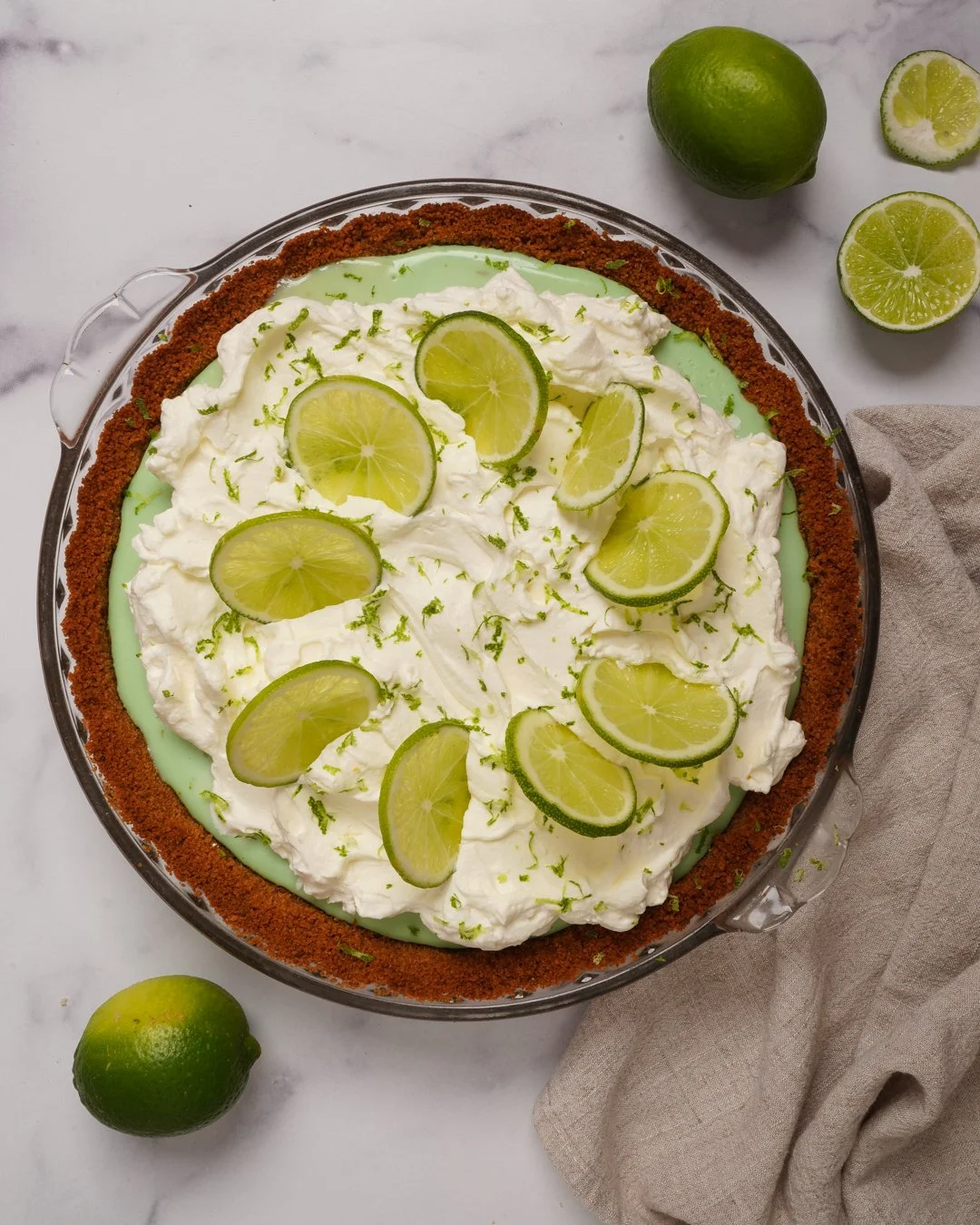 Right before serving, make the whipped cream. Combine the cream, tequila, and sugar in a large mixing bowl. Using the handheld electric mixer or the stand mixer fitted with the whisk attachment, beat the cream mixture until stiff peaks form. Spoon the topping onto the chilled pie and garnish with the lime zest and slices. The pie is best eaten the day it’s made because the crust will start to get a bit soggy over time, but it’s still delicious for several days. Store leftovers covered in the refrigerator for up to 5 days.