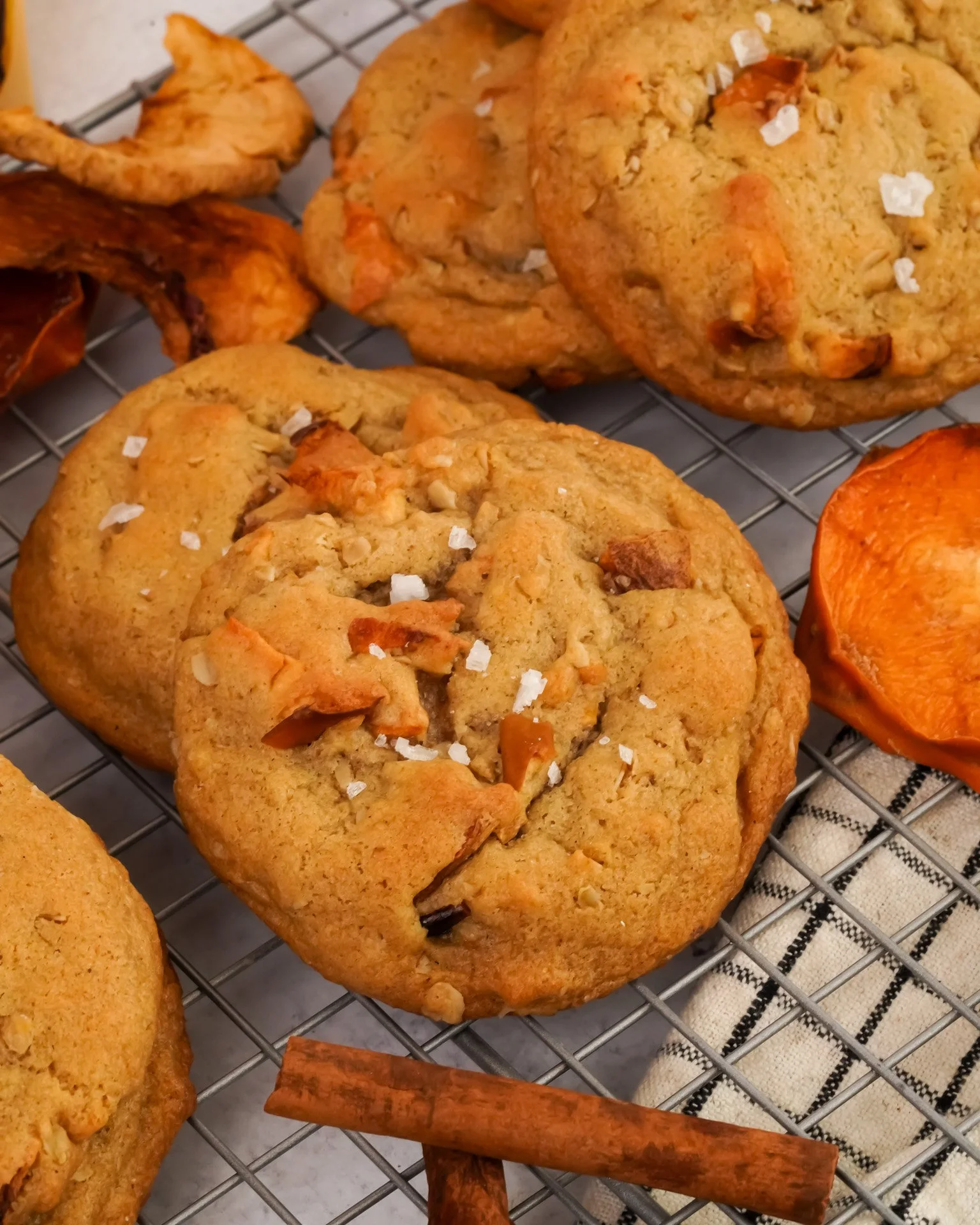 These Orchard cookies fit the autumn season like a glove. The cinnamon, brown butter, and oatmeal cookie crumb is loaded with sweet, chewy dried apples, peaches, and persimmons, and topped off with a sparkle of flaky sea salt. I could probably eat these all day long; they are that good! Pair them with some hot tea or apple cider, and you have a late fall dream!