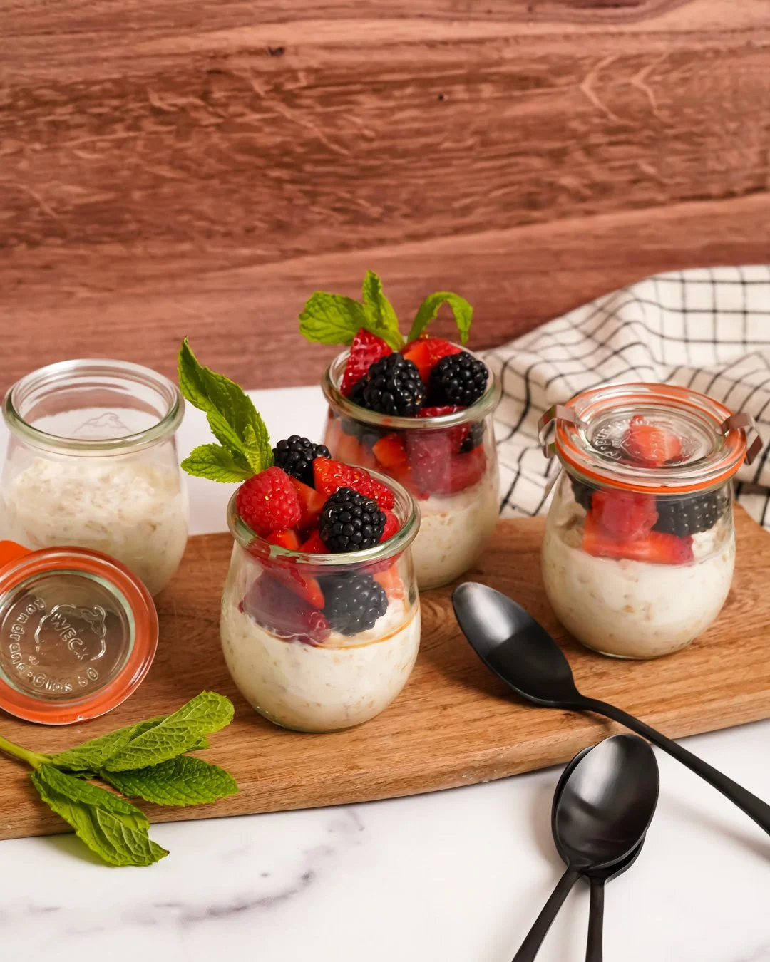 I have found that if you put anything in a cute little jar, kids will love it and want to eat it. I love mini Weck jars for this. Cut up veggies, green juice, and especially overnight oats, are all infinitely more delicious when packaged in sweet little Weck jars. Plus, individual jars make my life as a mom so much easier. I can cut all the veggies at once, or mix all the oats in advance, and have a perfect little meal or snack ready whenever my kids need it. Even adults like the experience of eating out of glass jars!