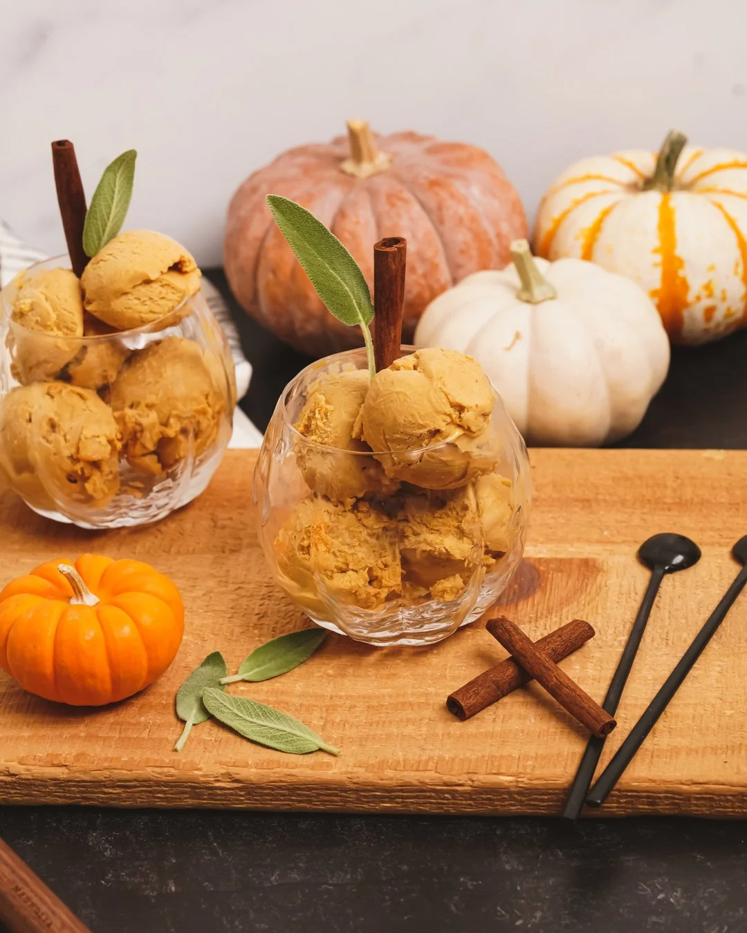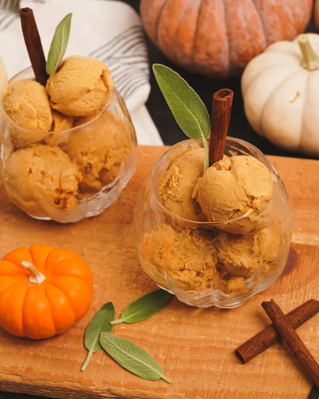 Lastly, for a fancy flare at a harvest banquet or just to spoil your family, serve this yummy ice cream in pumpkin shaped glasses with a cinnamon stick “stem” and sage “leaves.” The kids will get such a kick out of their pumpkin shaped pumpkin ice creams.