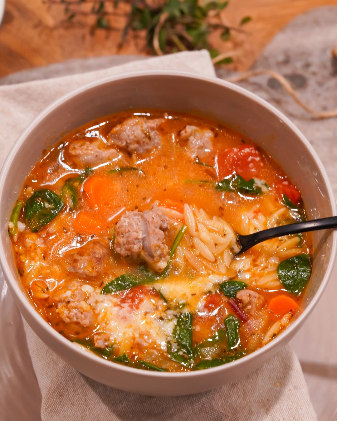 Golden seared sausage, tender orzo, rich tomato and herb infused broth, and a smattering of savory vegetables make this soup an absolute family favorite. Topped with grated parmesan cheese and a squeeze of fresh lemon juice, there’s really nothing more nourishing, or comforting, than hearty Sausage and Orzo soup on cold, January night.