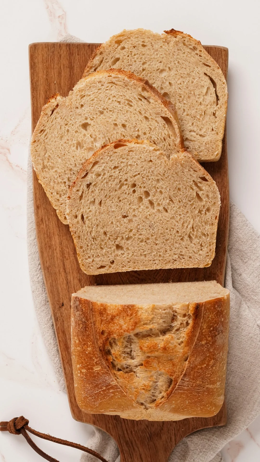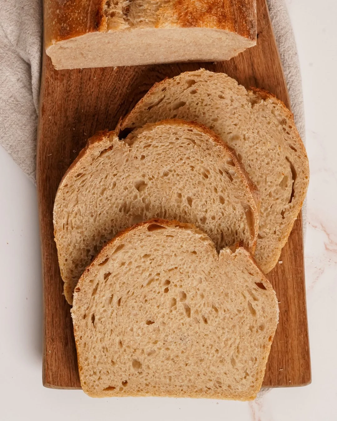 This bread is beautifully soft inside and out. The crumb is intentionally closed structured to hold sandwich filling, yet it remains light, fluffy, and delicious. The bread’s flavor is complex and savory even without enrichment from butter, milk, honey, or egg. The best part is that the dough is entirely naturally leavened, making this sandwich bread one of the most digestible and nutritious out there.