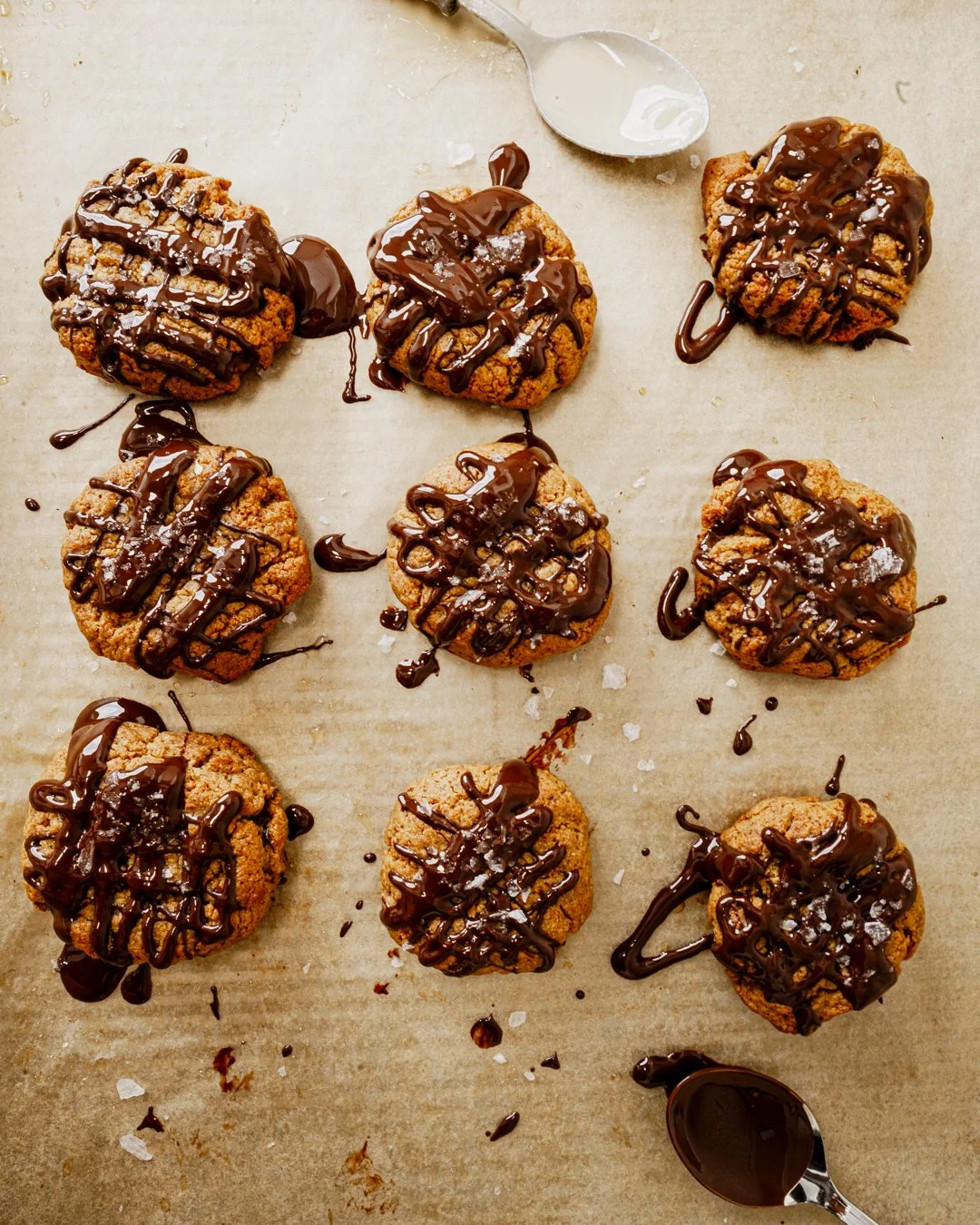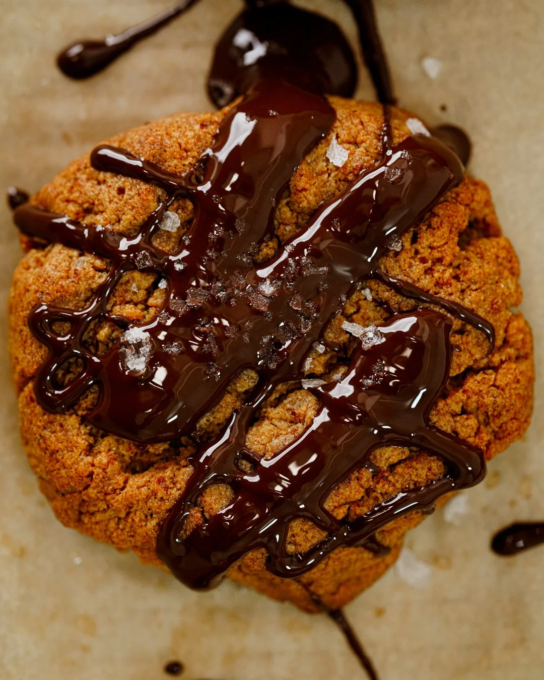 When the cookies are done baking, allow them to cool for 5 minutes on the baking sheet. Then top them with a thick drizzle of melted chocolate and a sprinkling of flaky sea salt. Cookies can be store covered at room temperature for a few days, but trust me, they won’t last that long!